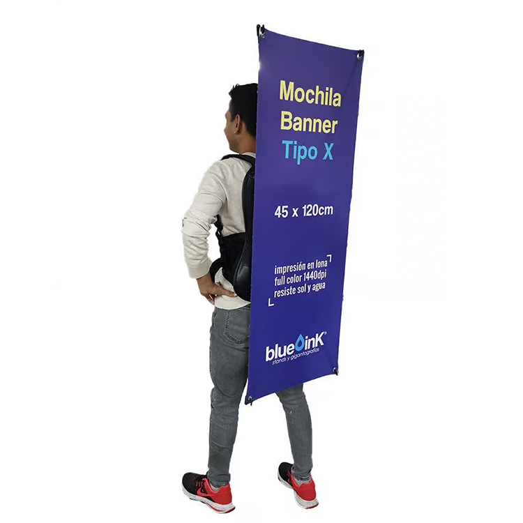 • Materiales: Mochila ergonómica con soporte de banner impreso en lona o tela.